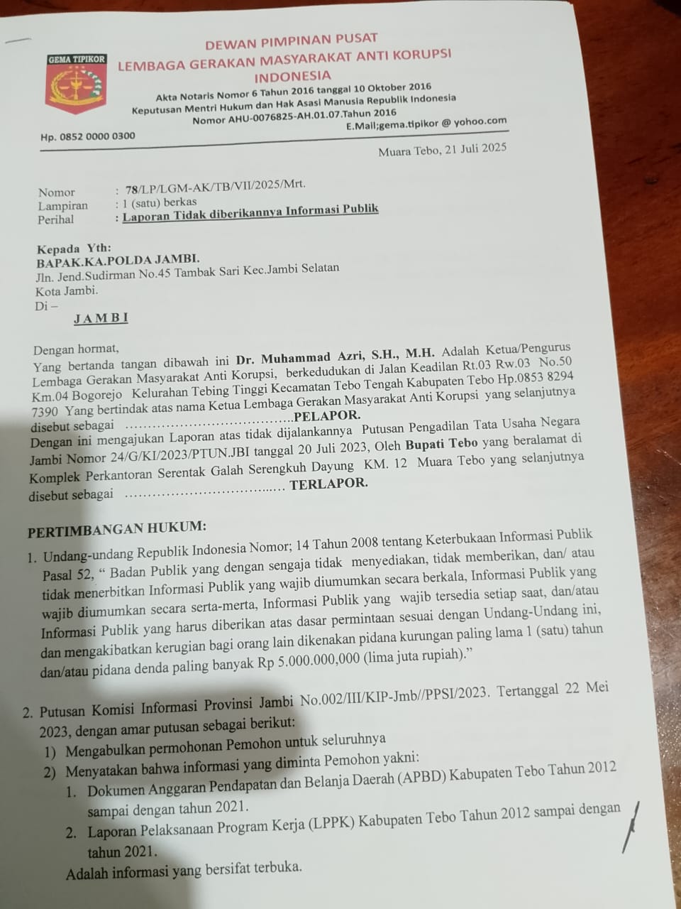 Gema Tipikor Jambi Akan Laporkan Bupati Tebo ke Bareskrim Polri