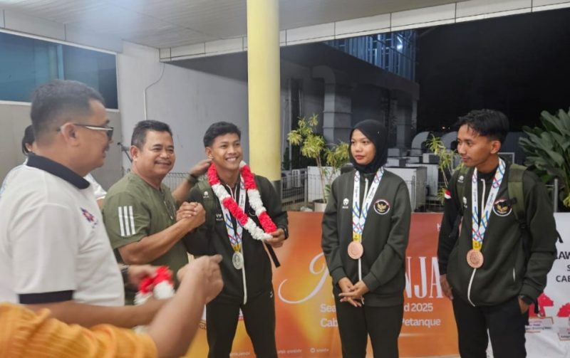 Kabarina.com – Pengurus Federasi Olahraga Petanque Indonesia (FOPI) Provinsi Jambi bersama Universitas Jambi (UNJA) menyambut kepulangan empat atlet asal Jambi yang sukses mengharumkan nama Indonesia pada ajang SEA Games 2025 di Thailand, Kamis malam.