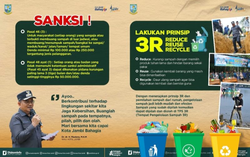 Di samping penegakan hukum, DLH juga terus memasyarakatkan gerakan peduli lingkungan melalui prinsip 3R (Reduce, Reuse, Recycle). Mahruzar mendorong warga Kota Jambi mengubah pola pikir dari sekadar membuang sampah menjadi mengelola sampah.