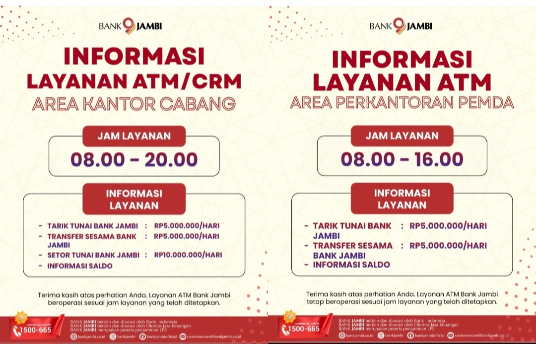 Adapun untuk ATM yang berada di luar kantor cabang, seperti di area perkantoran di kabupaten/kota di Provinsi Jambi, jam operasional tetap berlaku pukul 08.00 WIB hingga 16.00 WIB atau menyesuaikan dengan jam operasional setempat.