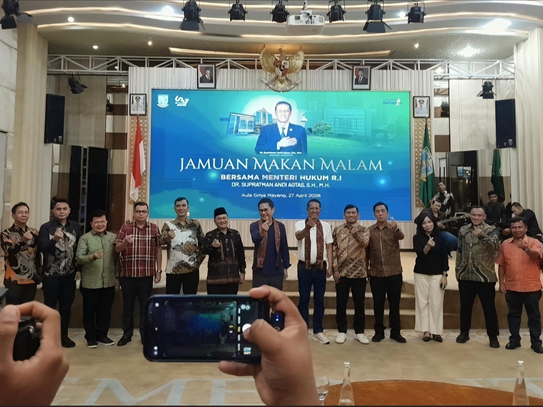 Kabarina.com – Pemerintah Kota Jambi menggelar jamuan makan malam bersama Menteri Hukum Republik Indonesia, Supratman Andi Agtas, di Aula Griya Mayang, Rumah Dinas Wali Kota Jambi, Senin malam (27/4/2026).