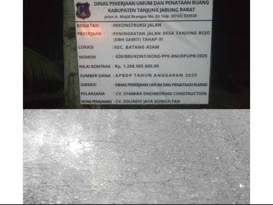 Kabarina.com – Proyek rekonstruksi jalan Desa Tanjung Bojo, Kecamatan Batang Asam, Kabupaten